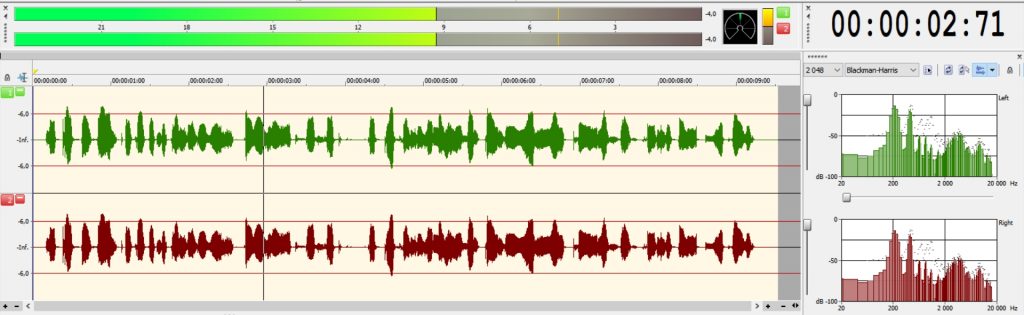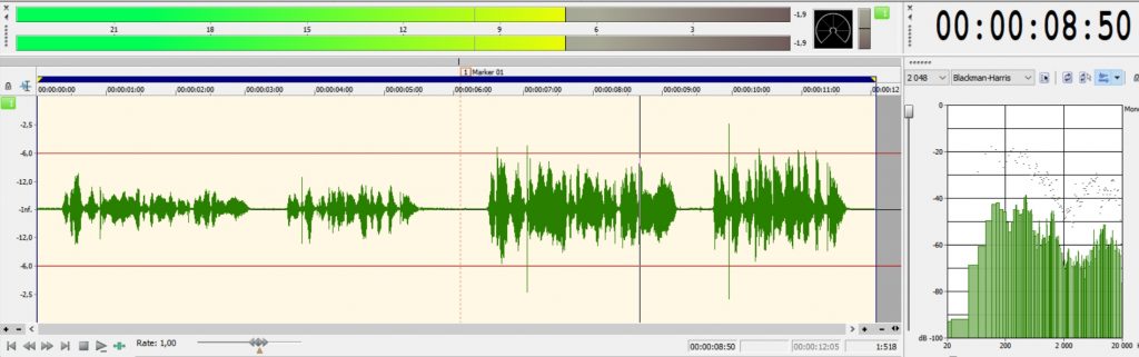 La voix est puissante, le niveau régulier et le bruit de fond absent. Cet enregistrement est parfait pour réaliser un montage vidéo de qualité semi professionnelle. Sa dynamique et le spectre des fréquences n’ont pas été corrigés dans Sound Forge Pro